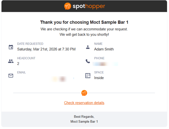 Within the email notification, the guest will receive a "Check Reservation Details” link. Clicking this link opens the Reservation Details page, where they can view their reservation status and full booking details, as well as add a comment or cancel their reservation.