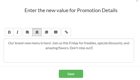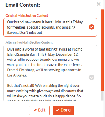 You can also edit the content (body) of your emails, though the available options depend on where the email was generated. Most email blasts are created from Promotions, which offer more flexibility and customization than those generated from Events.