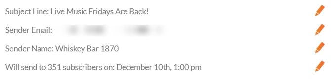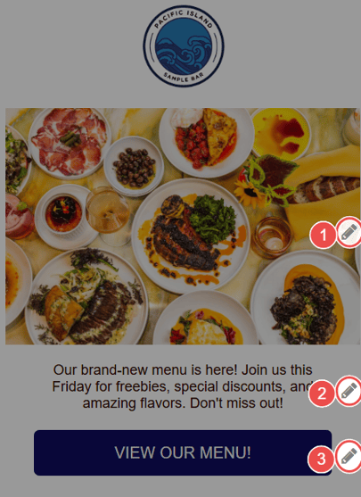For emails generated from Promotions, you will have a pencil icon on the right side of each section. Each icon corresponds to a different element: