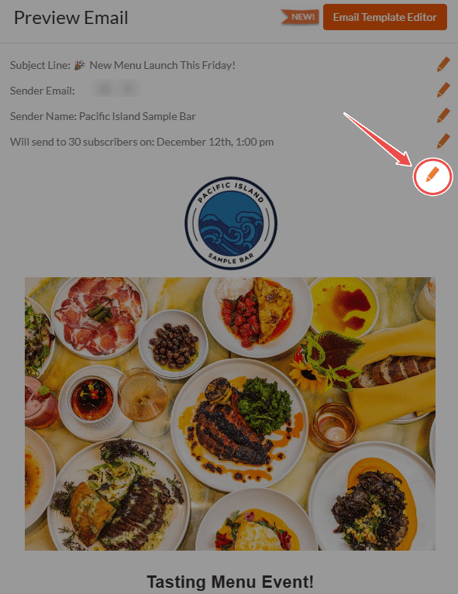 After opening the preview by clicking the pencil icon in the top-right corner of the event email, you’ll see another pencil icon on the right side of the page — just below the email information.
