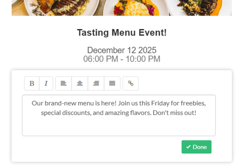 These sections can be used to highlight different types of content — for example, an upcoming event, a featured menu item, or a special offer.