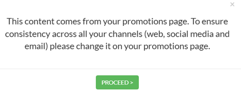 - Button - Clicking the pencil icon next to a button will prompt you to open the associated promotion, as CTA buttons can’t be edited directly from the email page. Select Proceed > to open and update the promotion.