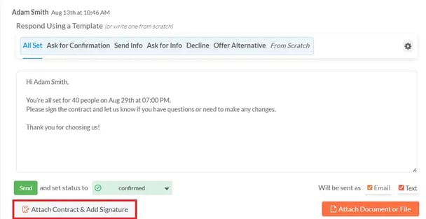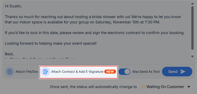 When you receive a private party inquiry and open the inquiry details page, you will notice that you have an "Attach Contract & Add E-Signature" button just below the message field.