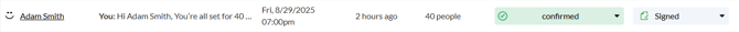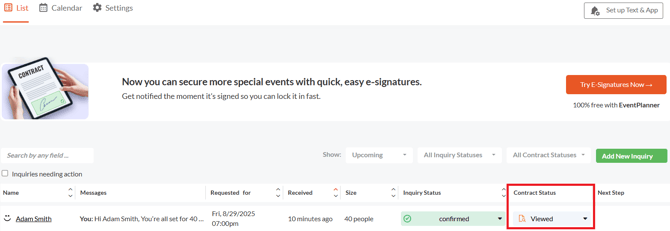 Finally, send your inquiry response along with the attached contract. You can track the contract status at any time, by navigating to the "List" view on the "Party/Group Inquiries" page: