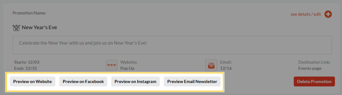 After setting each marketing channel for a single promotion, you can preview what you've customized by clicking the corresponding preview buttons shown below.