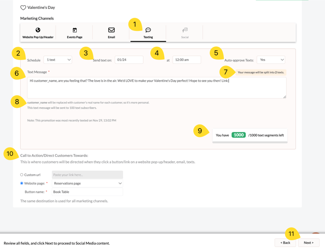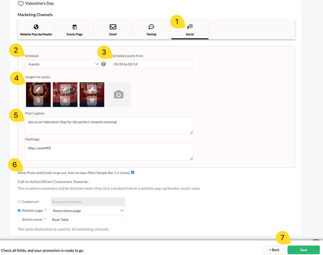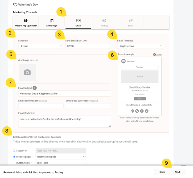 - Select how many emails to send. You can choose one email for promotions that have a set day (e.g. Valentine's day), or have ongoing email blasts for continous promotions (reservations, catering, etc.)