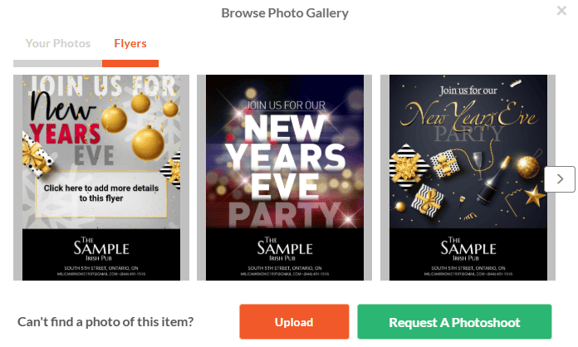 Unlike custom promotions, standard promotions include pre-uploaded flyers. When you click the camera icon to upload an image for your pop-up, email, or social post, you can upload a new image, choose one from your gallery, or select a flyer.