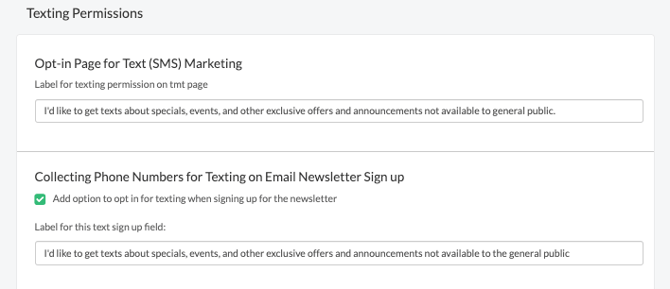 The "Texting Permissions" section allows you to set up where and how customers will be asked to opt in to get text messages.