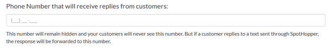 This number is hidden from your customers. When a customer replies to a text sent through SpotHopper, their text is forwarded to that phone number. They can only see your number if you text them back directly.