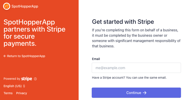 3. After you click "Connect with Stripe," you will be taken to the page where you can either connect your spot with an existing Stripe account or you can fill in the necessary information and create a new account.
